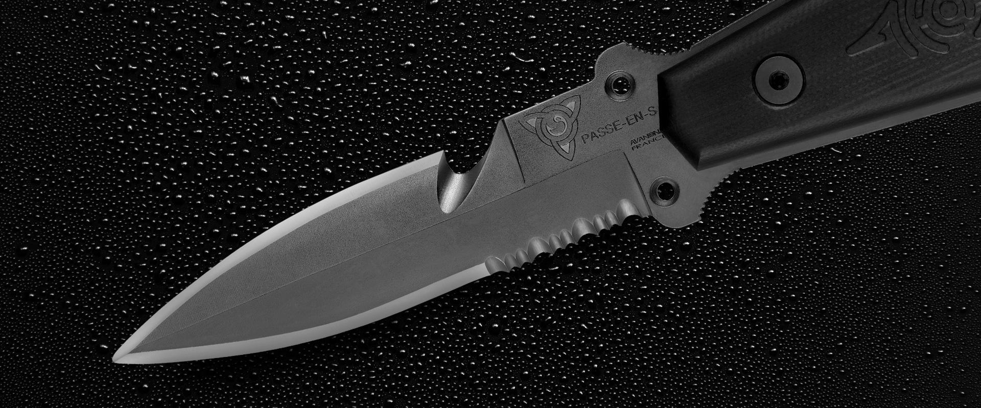 L'étui auto-aiguisant garantissant le tranchant permanent de la lame accompagné d’une gamme de couteaux et équipements forgés pour l’aventure.