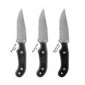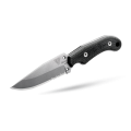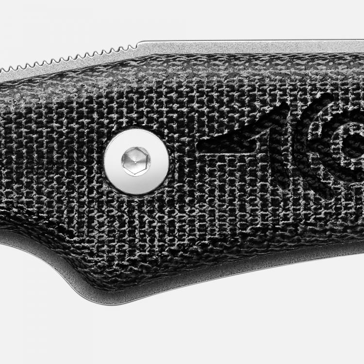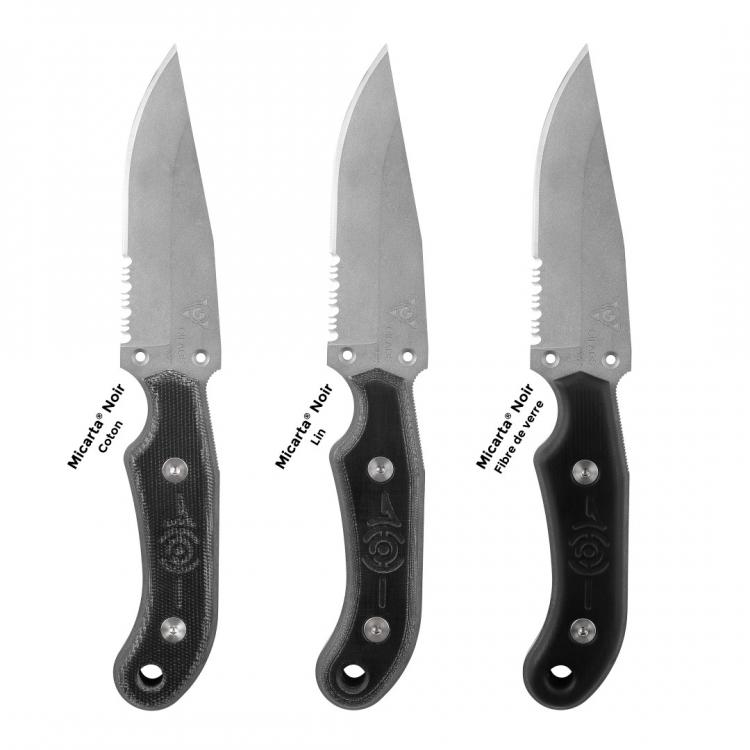 3,5 mm d’épaisseur, pleine soie, en acier inox Mox 27Co. Après traitement, fort coefficient de dureté (60-61 H.R.C.) et haute résistance à la corrosion. Les lames sont fabriquées à Thiers. Les 2/3 avant de la lame sont affûtés pour des travaux de précision. Elles sont dotées également d’un segment de micro-dentures pour couper rapidement cordes et sangles.