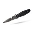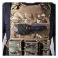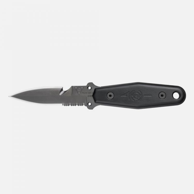 3,5 mm d’épaisseur, pleine soie, en acier inox Mox 27Co. Après traitement, fort coefficient de dureté (60-61 H.R.C.) et haute résistance à la corrosion. Les lames sont fabriquées à Thiers. Les 2/3 avant de la lame sont affûtés pour des travaux de précision. Elles sont dotées également d’un segment de micro-dentures pour couper rapidement cordes et sangles.